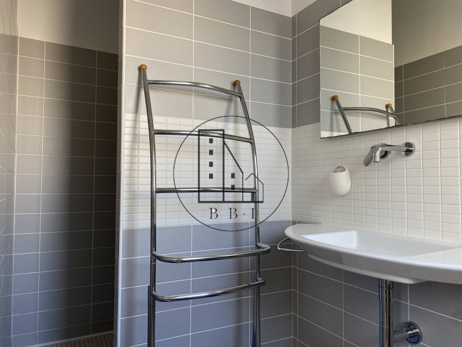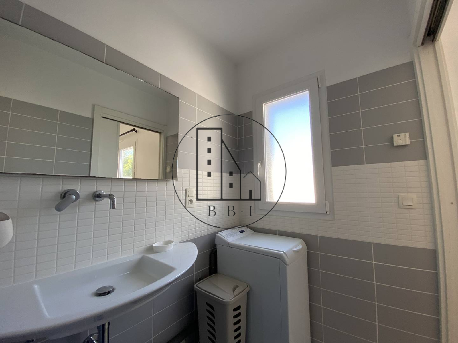 -Et d'une salle d'eau avec douche à l'italienne, lave-linge, vasque,radiateur sèche serviette, étendoir à serviette, meuble de rangement;