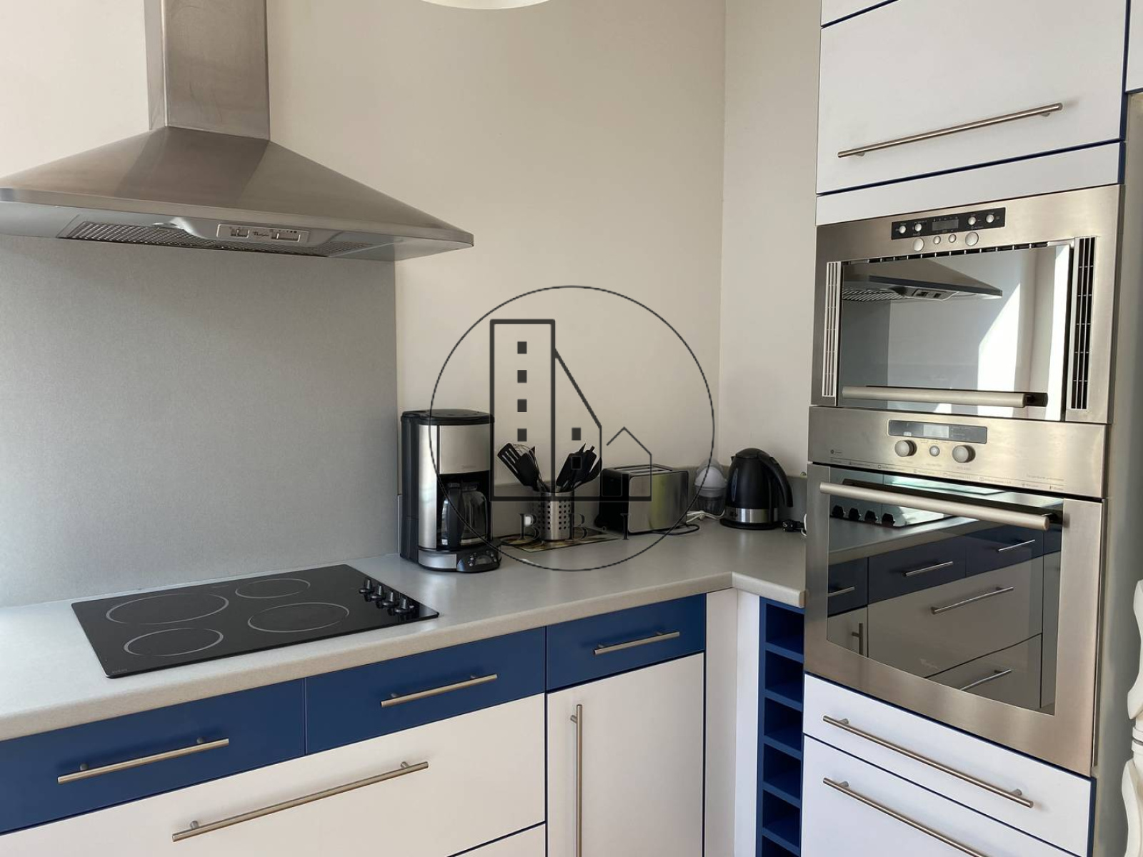 -Une cuisine ouverte équipée avec four, évier, lave-vaisselle, réfrigérateur congélateur, plaques vitrocéramiques, cafetière, bouilloire, grille-pain.