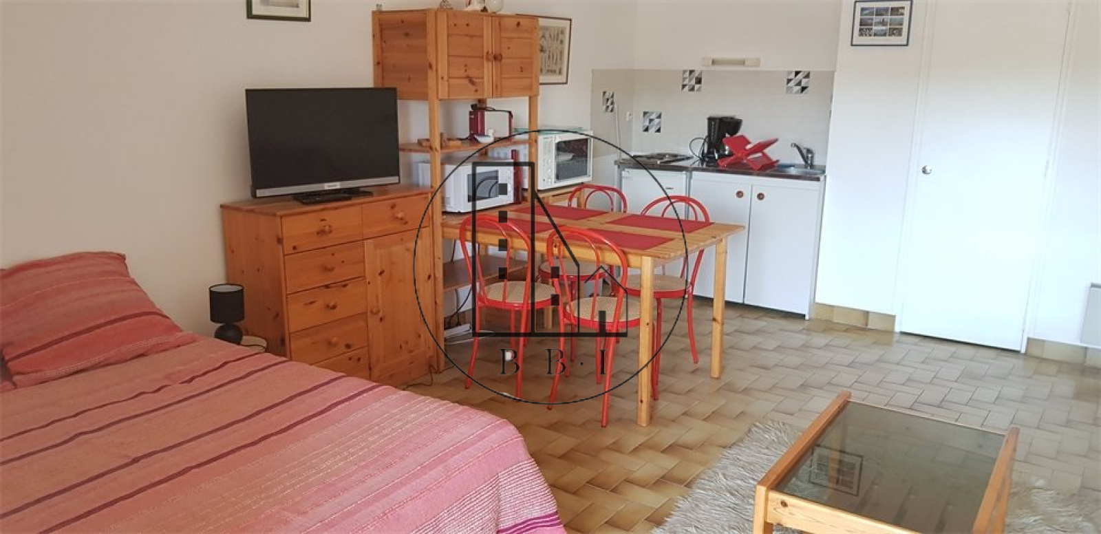 -Une pièce de vie avec canapé et fauteuils, table à manger 4 personnes, 1 lit 2 personnes (140*190cm), TV, baies vitrées donnant accès au balcon;